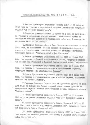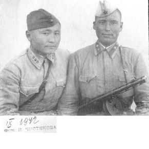 Исаев Мулдабек Исаевич (1916-1977) встретил войну будучи красноармейцем штабной службы и офицеров штаба 81 моторизованной дивизии Киевского особого военного округа. 22.06.1941 находился во Львове, где дислоцировались части и штабы этой дивизии (4-й мотострелковый корпус 6-й Армии). С первых дней войны получил боевое задание обеспечить сохранность документов политотдела, партийных и комсомольских документов. К середине июля дивизия была привлечена к обороне Киева. В начале сентября этого же года части дивизии были брошены для отражения попытки немцев форсировать Днепр. После выхода из окружения штаб дивизии сосредоточились в городе Ахтырске в подчинении штабу 21 армии. Был отобран в штаб и политотдел Армии в числе показавших боевые качества и смелость красноармейцев. В марте 1942 года получил звание младшего политрука и назначение в качестве инструктора политотдела 301 стрелковой дивизии, воевавшей под городом Волочанском Харьковской области.